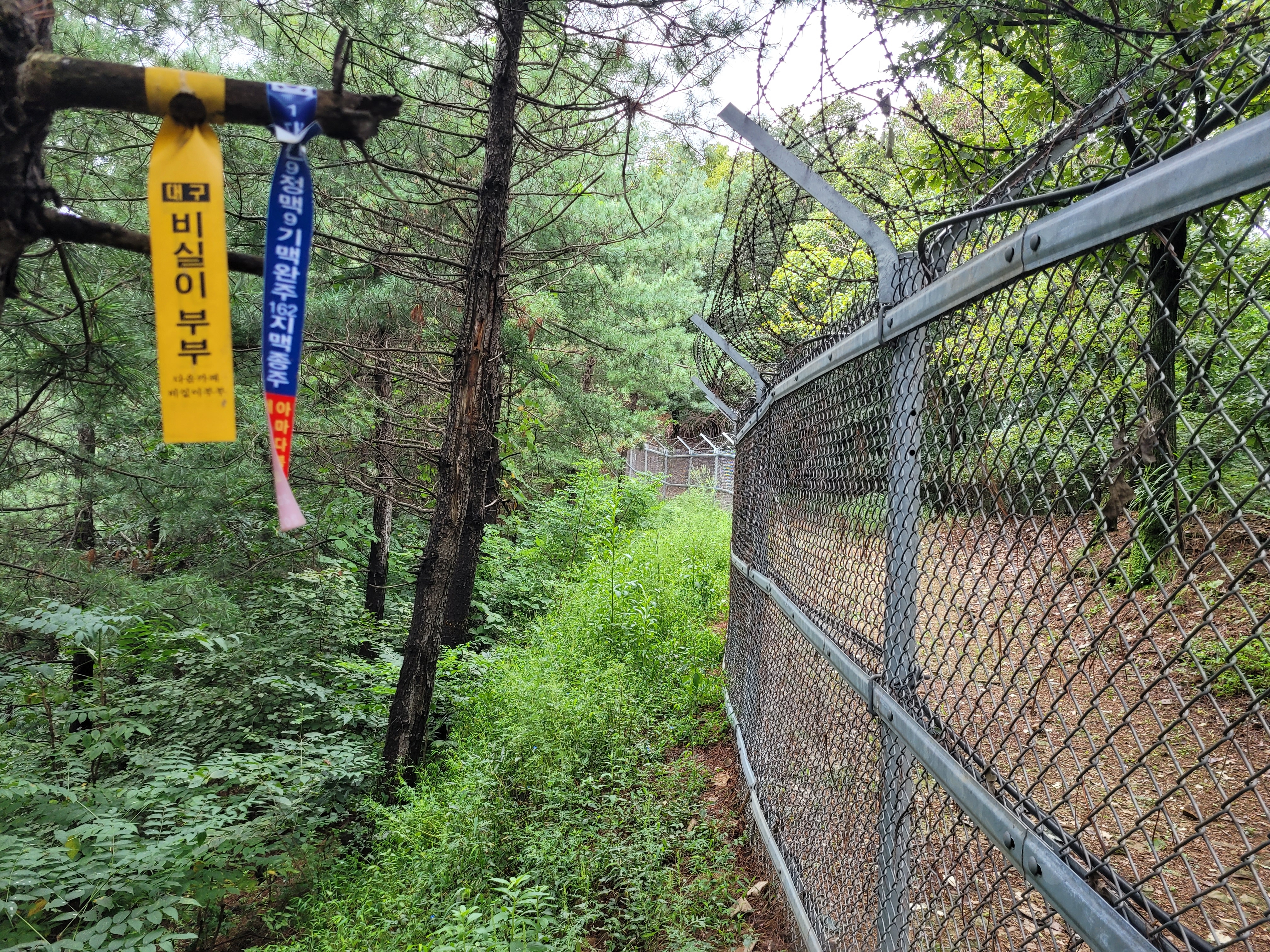 2.이번구간은 군부대 철책산행이라고나 할까. 철책 따라서 가다보면 개미산 전위봉인 580봉이 최고봉이다. 개미산은 이지역에서 지명을 딴 마을과 상점들이 있는 것을 보면 알 수 있듯이 멀리서 보면 개미모양을 하고 있어 유명한 듯 하다. 개미산은 정상은 정작 군부대 철책옆에 초라하게 약간 높음직한 봉우리에 정상석도 없고 다만 반바지 님이 달아놓은 코팅이 찢겨진 산패만이 놓여있다.